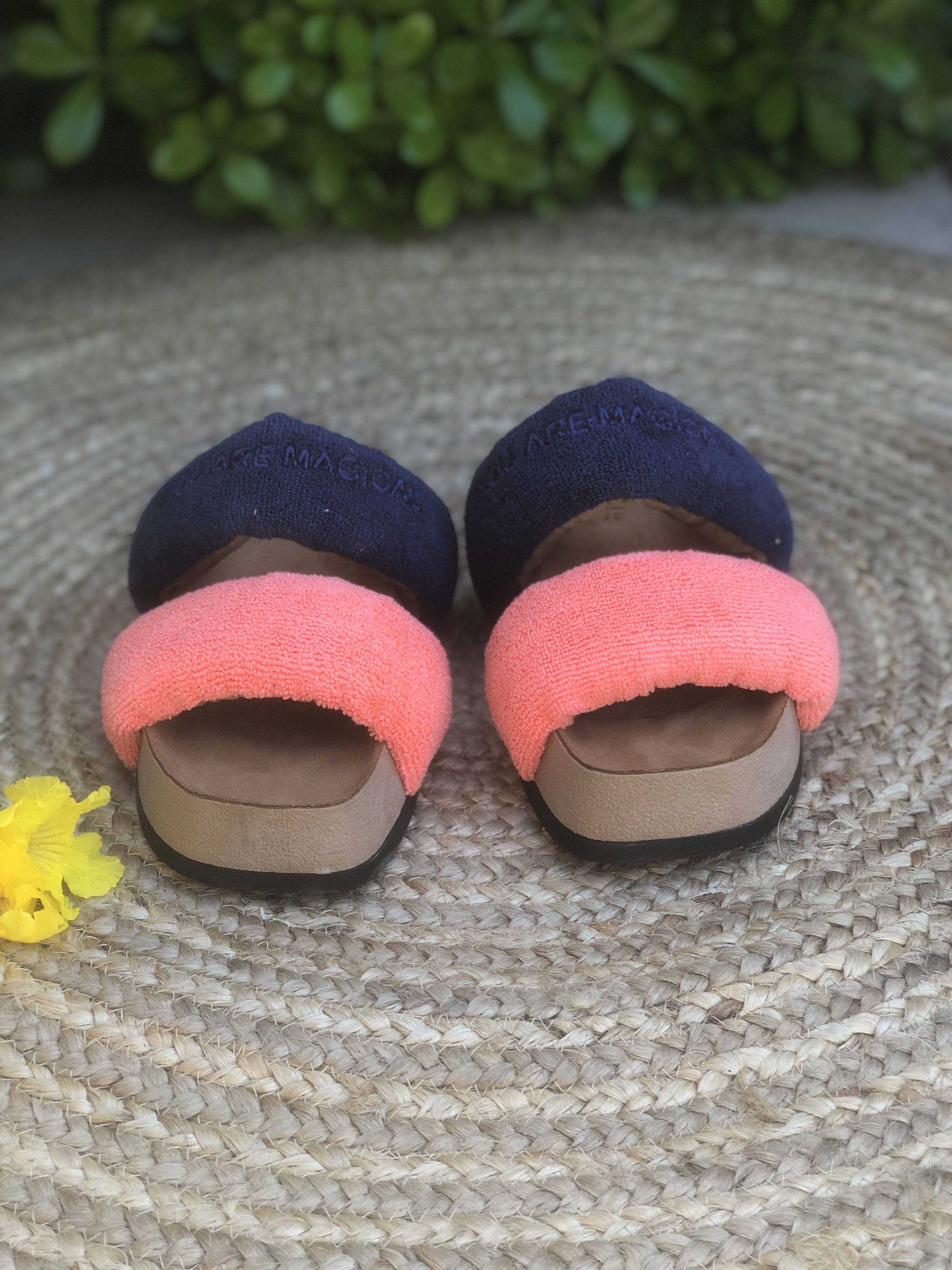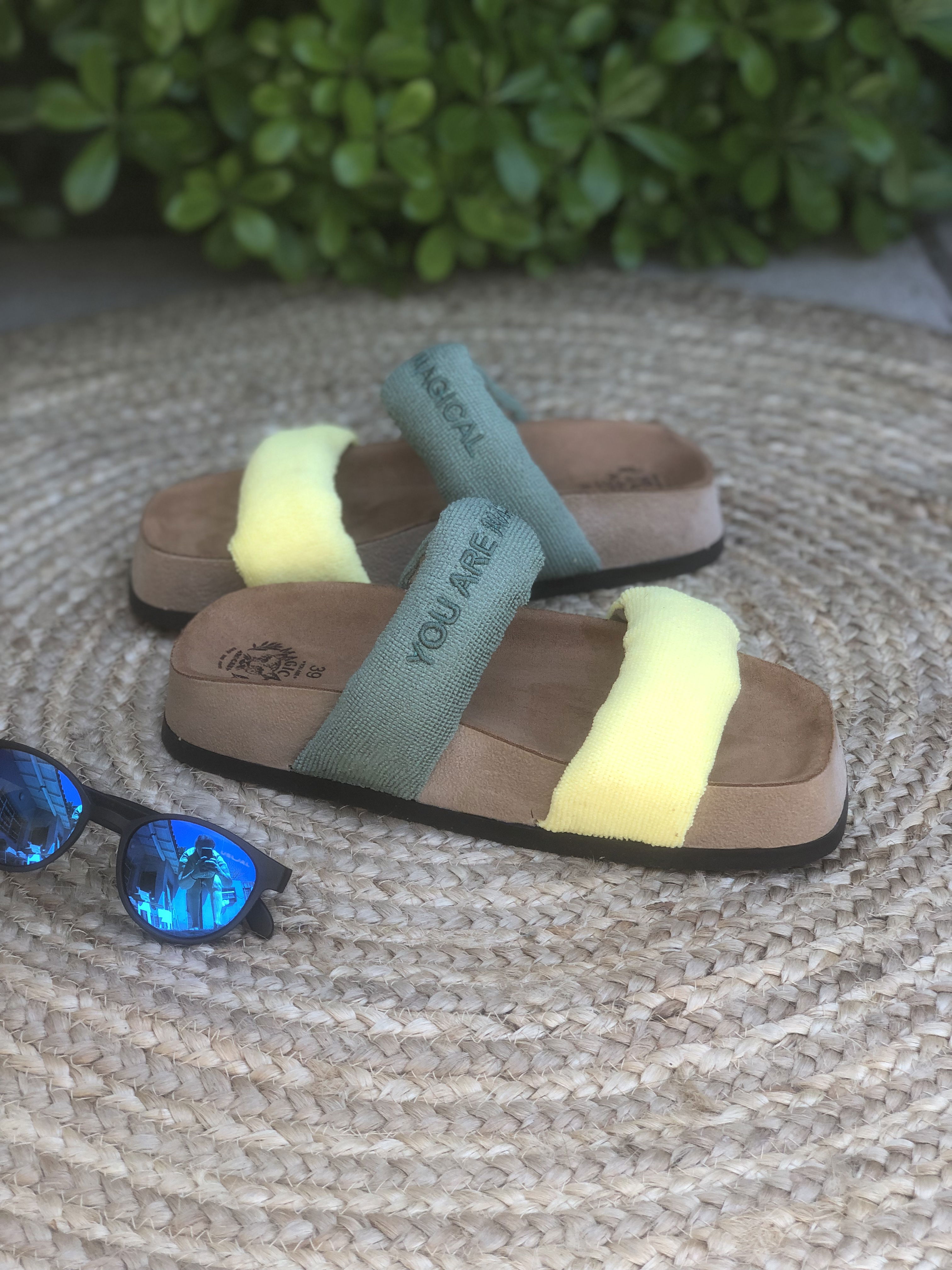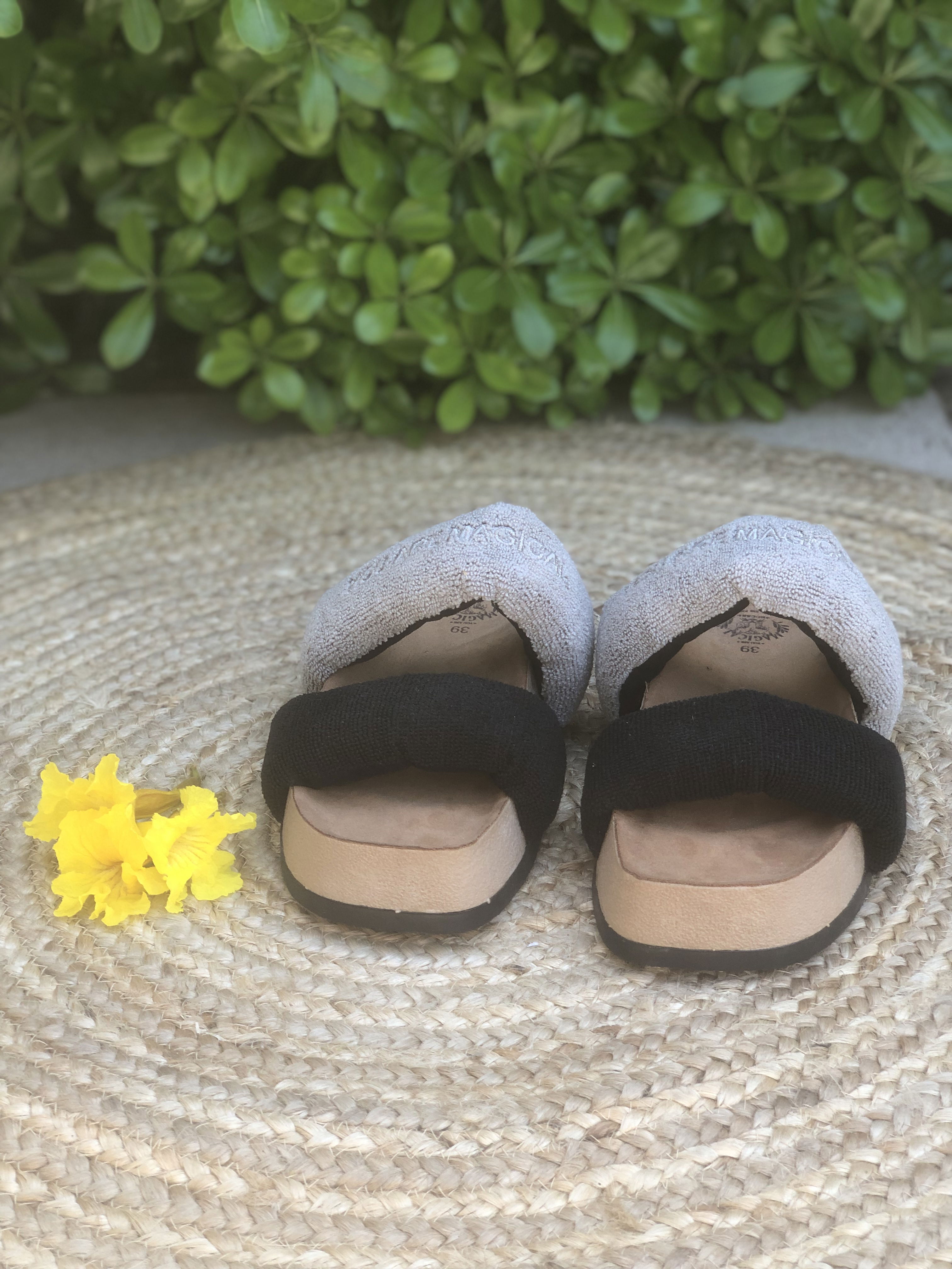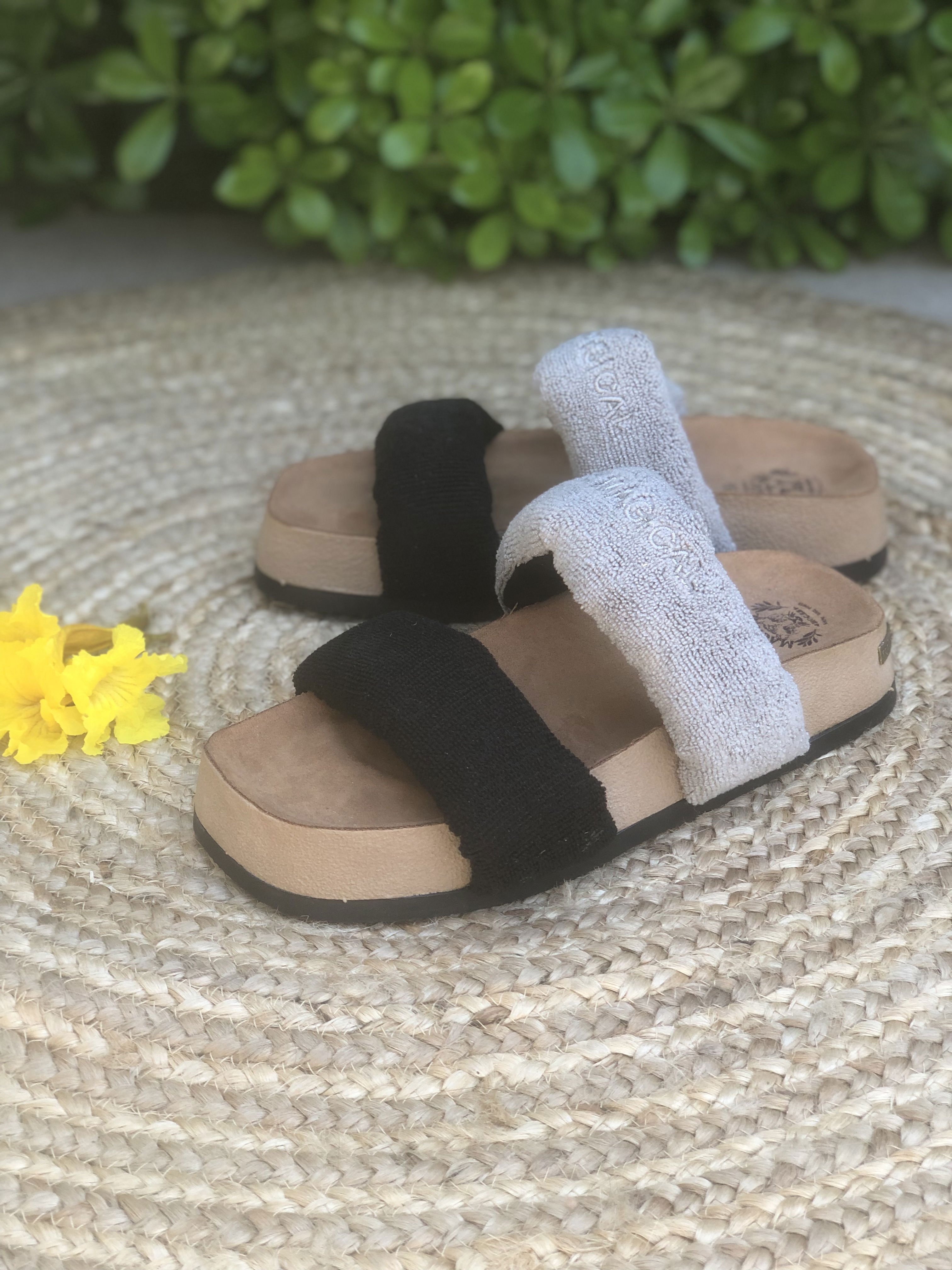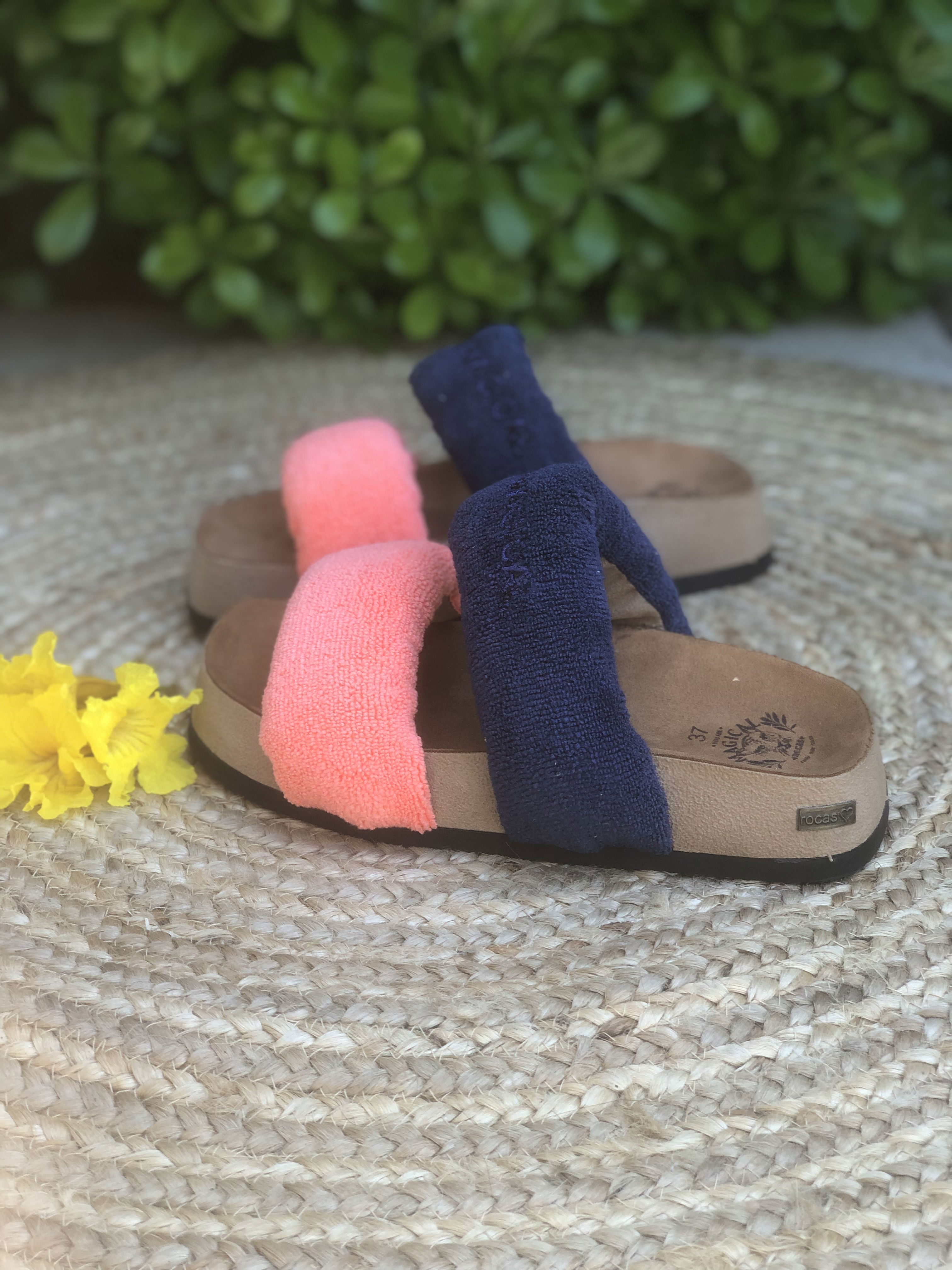 Presentan una parte superior que se compone de dos fajas anchas ubicadas en la parte delantera del pie. Estas fajas están rellenas de espuma con memoria, un material que se adapta a la forma del pie y proporciona comodidad personalizada. Este relleno de espuma también le da volumen lo que le da un aspecto más llamativo y trendy. Las Tokio están hechas de toalla microfibra, un material suave y comfy. La plantilla esta forrada en un suede ofreciendo una sensación suave y acogedora al caminar. La suela es plana, brindando estabilidad y confort al caminar.