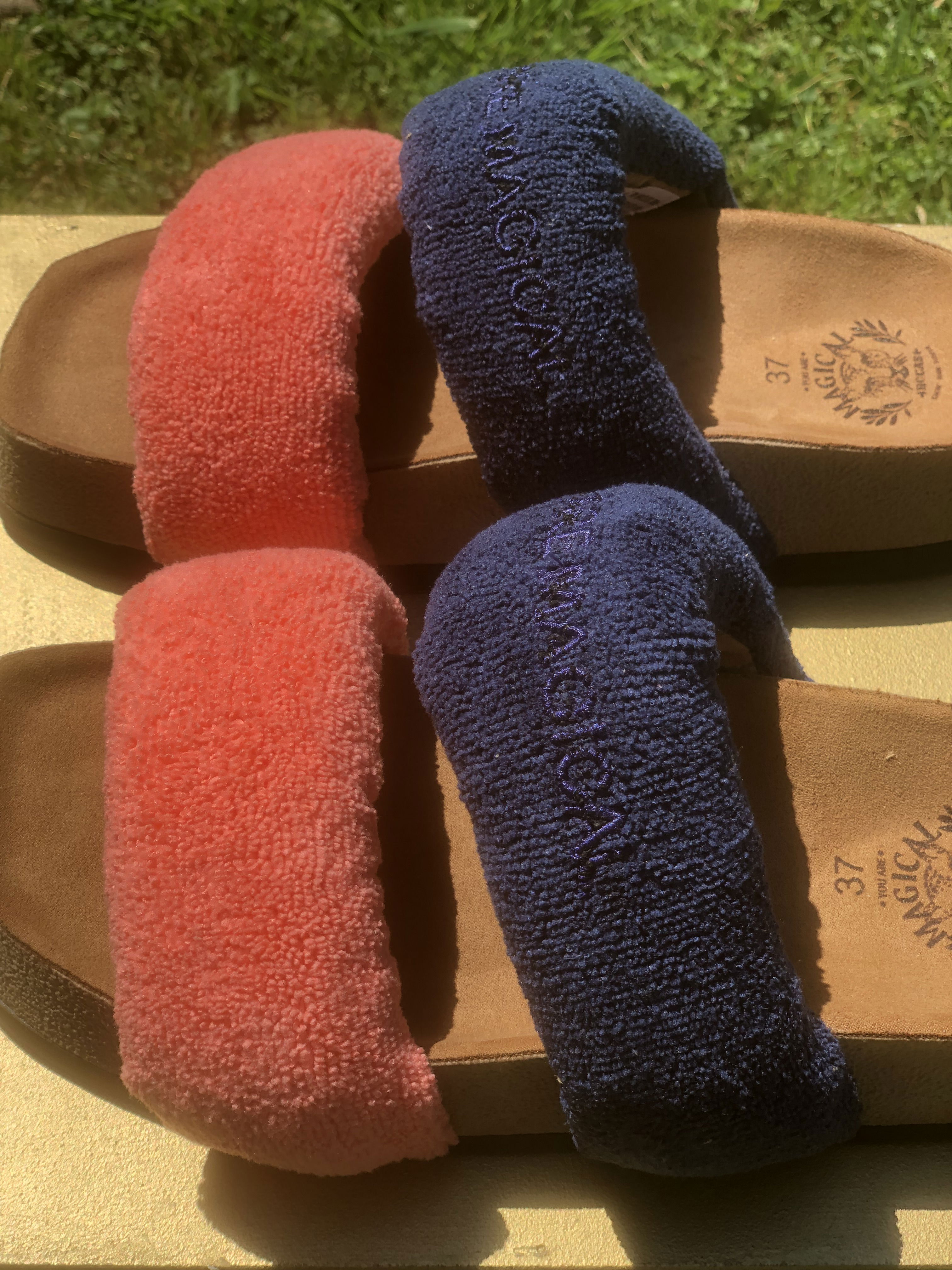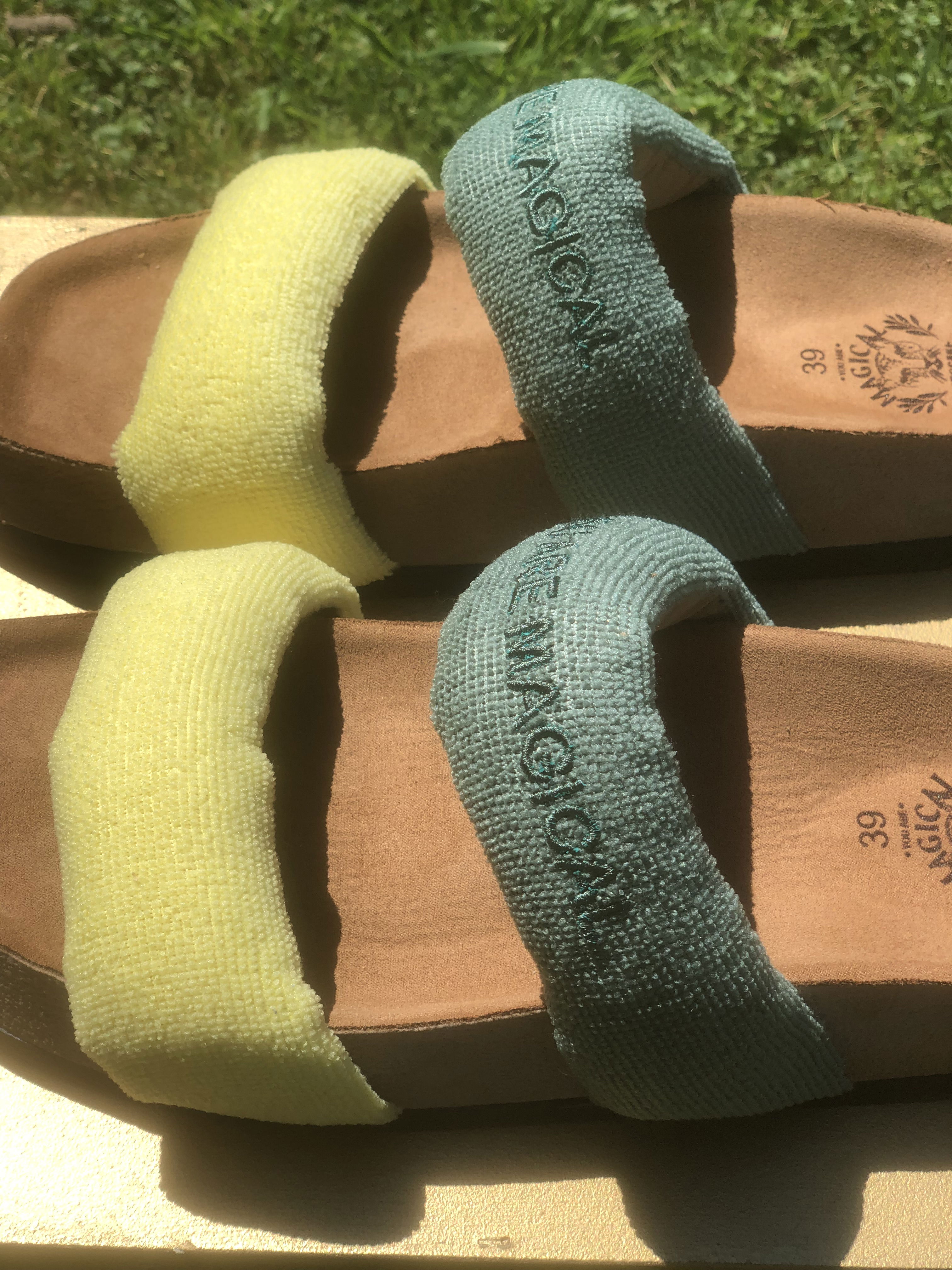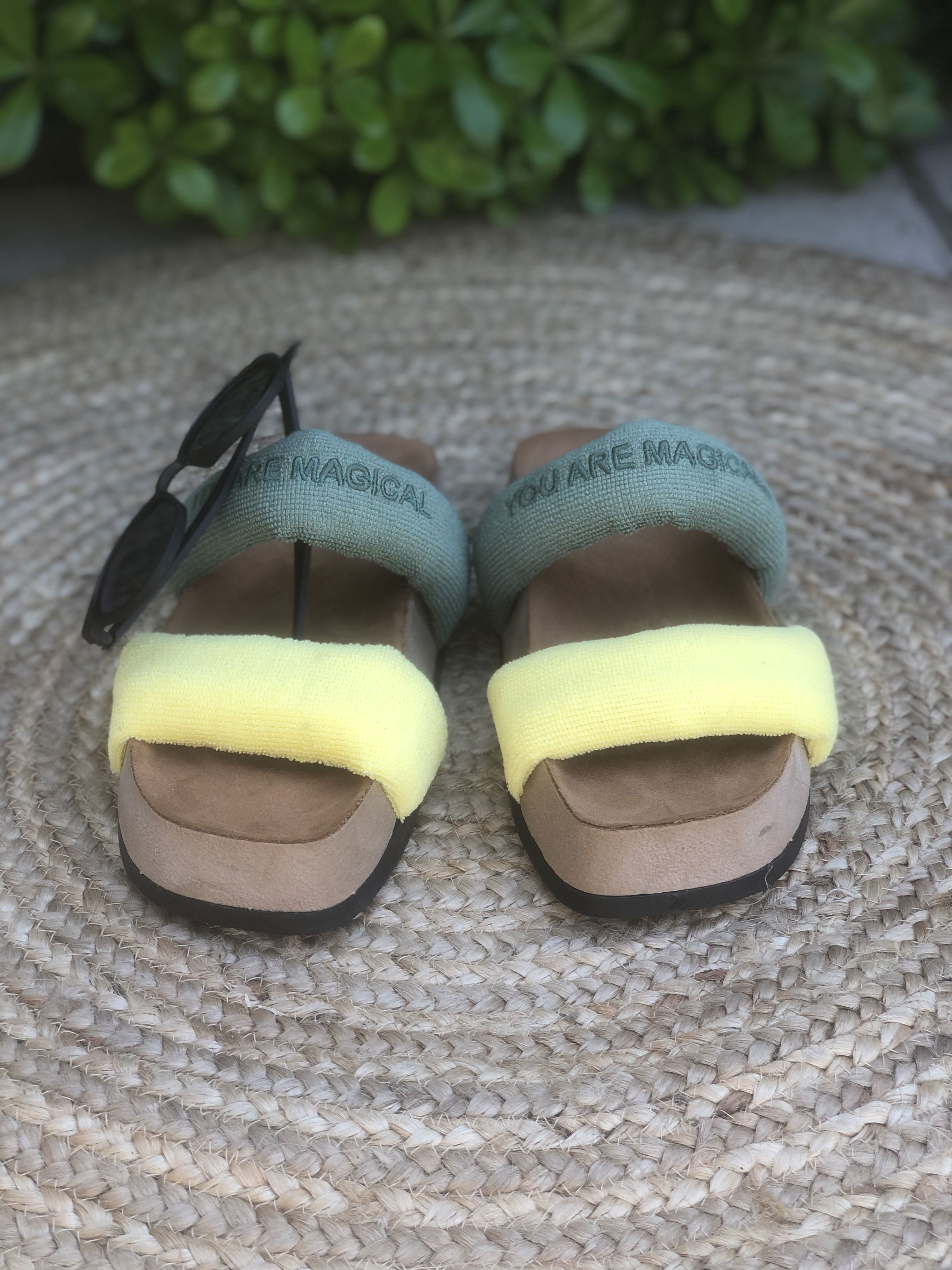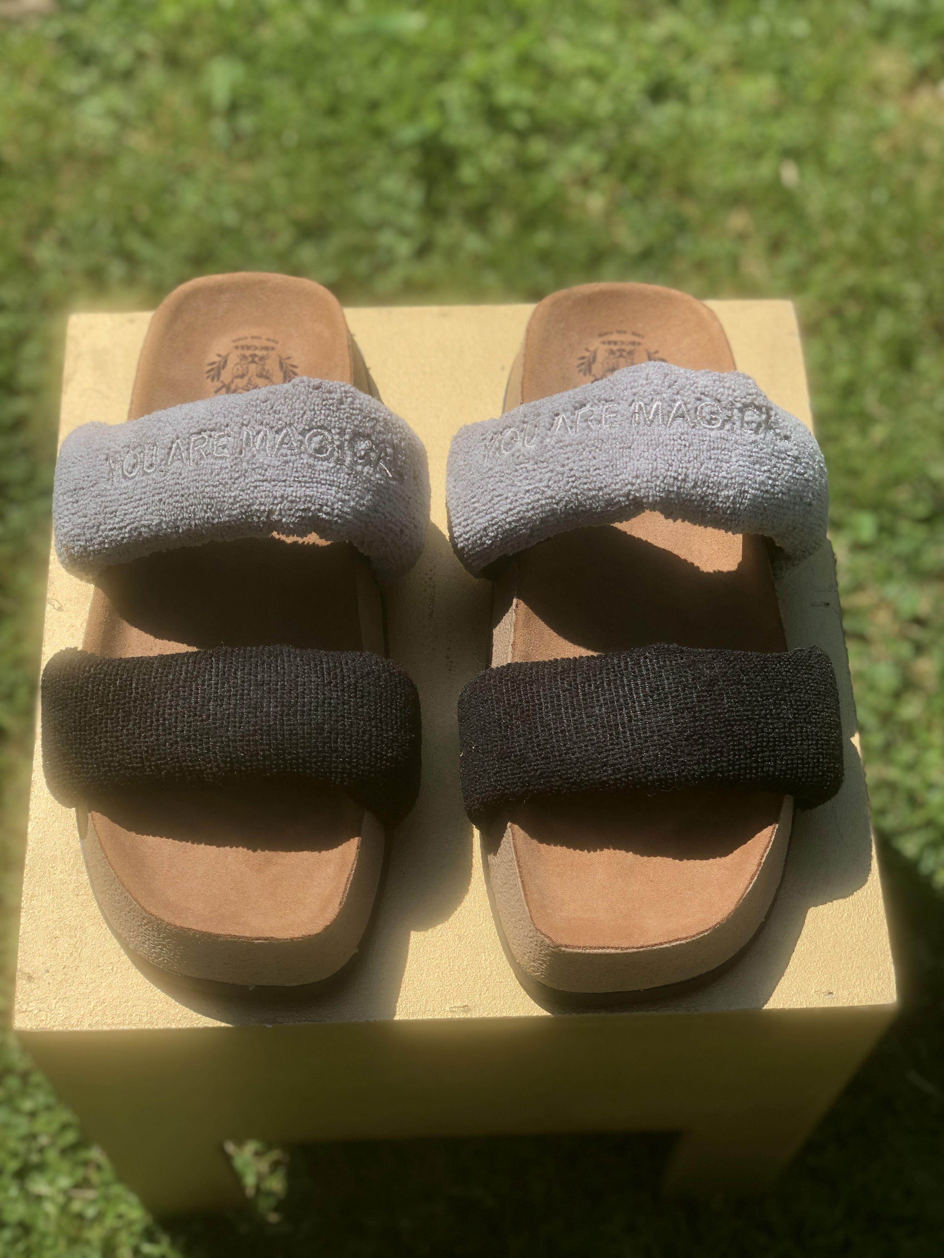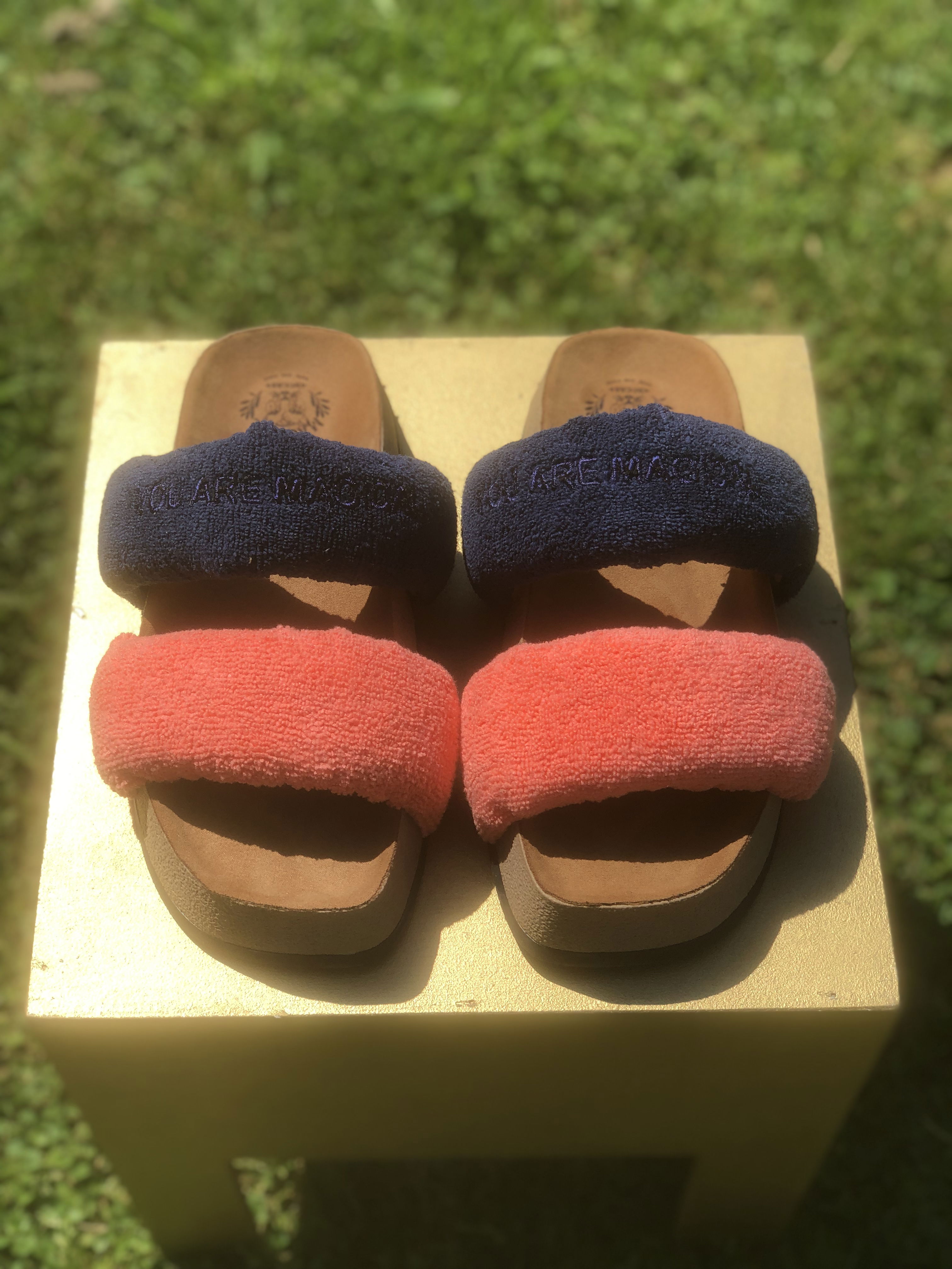 Presentan una parte superior que se compone de dos fajas anchas ubicadas en la parte delantera del pie. Estas fajas están rellenas de espuma con memoria, un material que se adapta a la forma del pie y proporciona comodidad personalizada. Este relleno de espuma también le da volumen lo que le da un aspecto más llamativo y trendy. Las Tokio están hechas de toalla microfibra, un material suave y comfy. La plantilla esta forrada en un suede ofreciendo una sensación suave y acogedora al caminar. La suela es plana, brindando estabilidad y confort al caminar.
