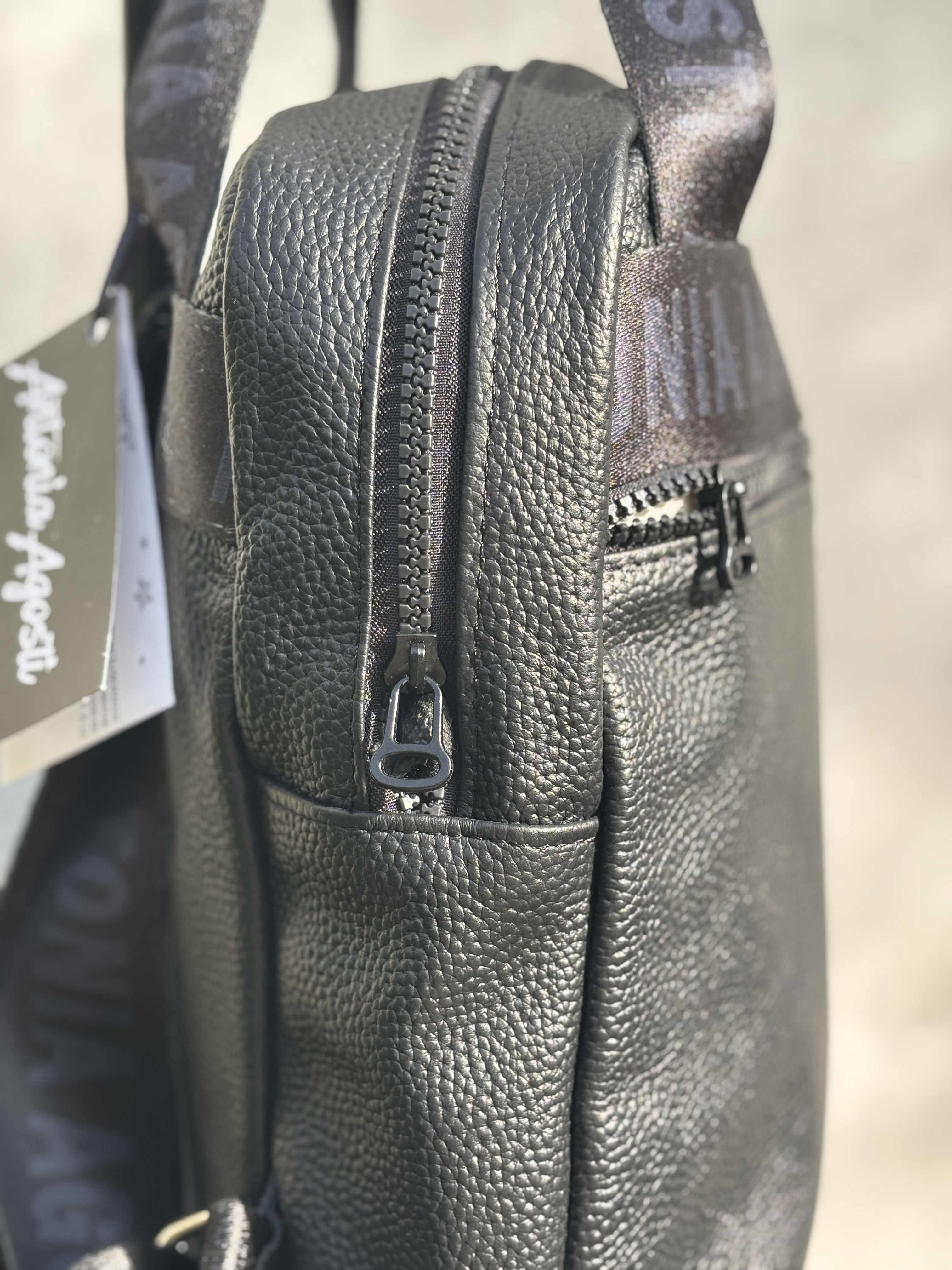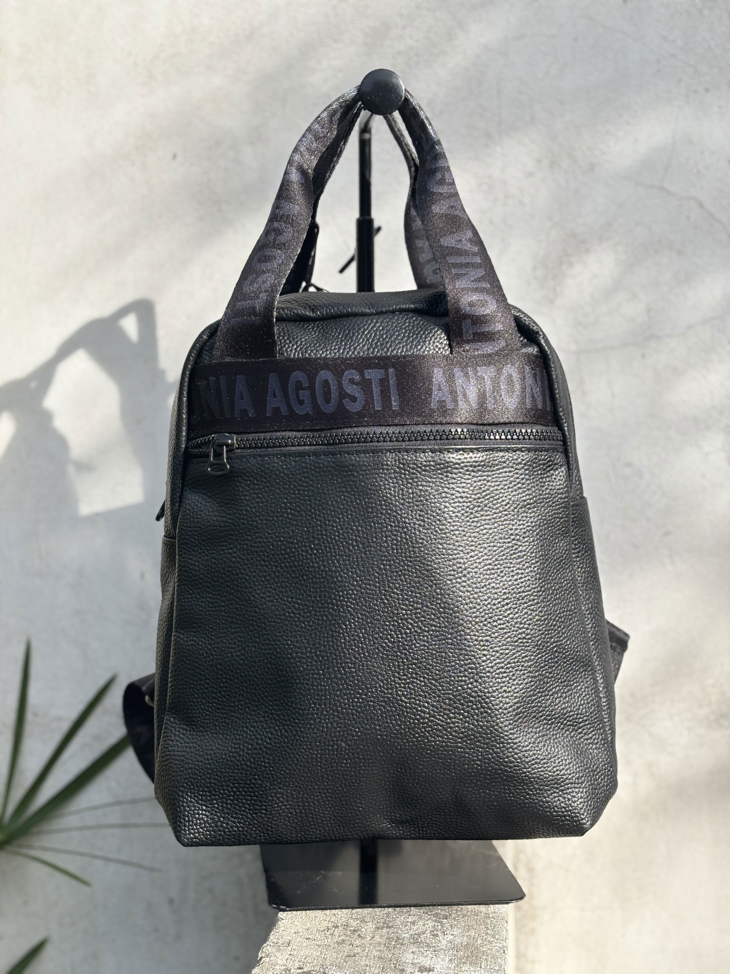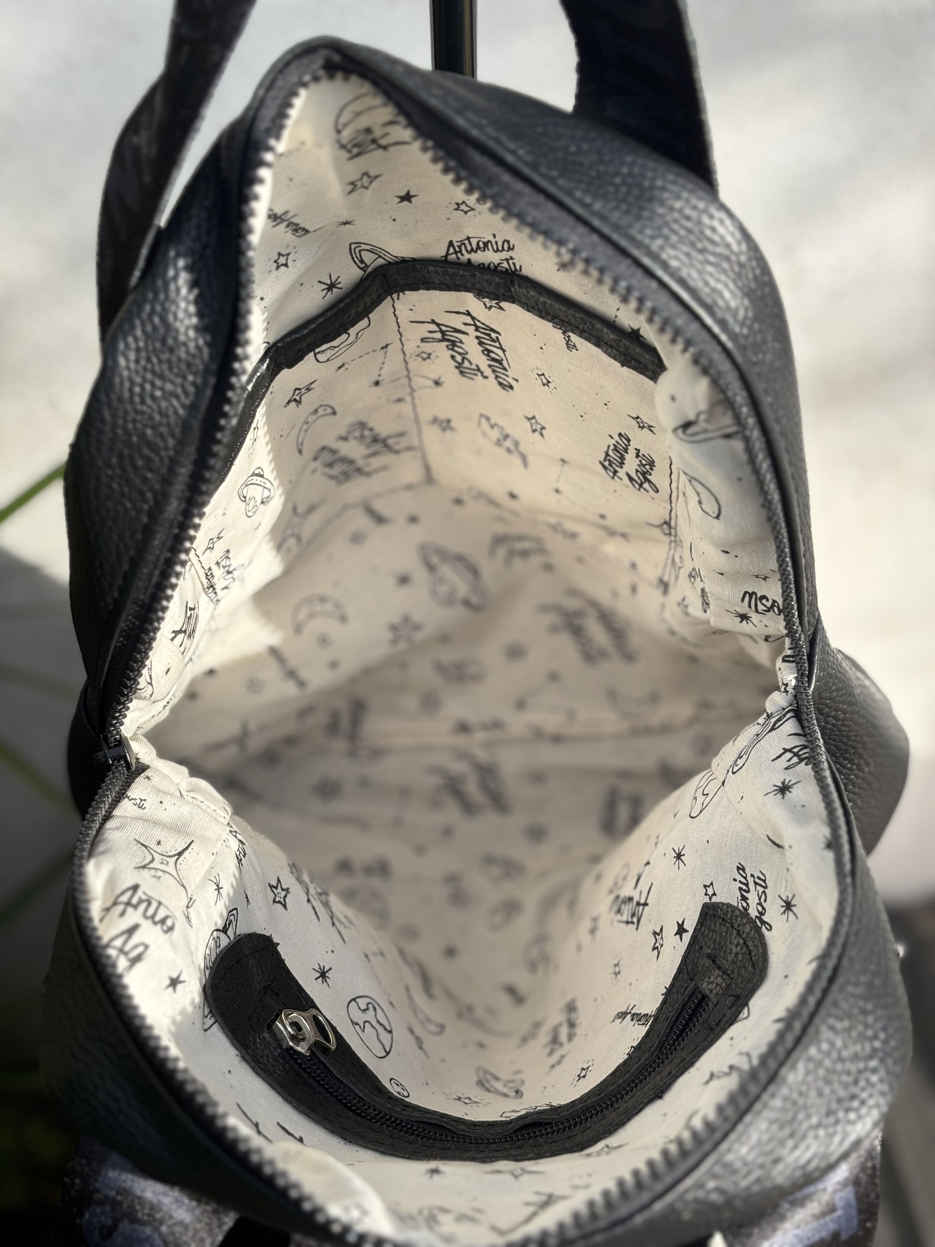 Mochila confeccionada en cuero vacuno, forrada en su interior con tela personalizada de la marca. Posee un bolsillo delantero profundo para que puedas llevar los objetos que necesitas de más fácil acceso. En su interior tiene dos compartimientos para el celu y un bolsillo con cierre. Sus correas son sublimadas con estampas de Antonia. Las correas permiten que la lleves como mochila y también como cartera. Es una mochila de tamaño intermedio ideal para el uso diario.